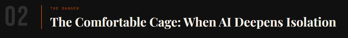 That comfort, if mistaken for connection, becomes a trap. The friction of real relationships — the awkwardness, the misunderstandings, the vulnerability of being truly known and sometimes rejected — is not a bug. It's the mechanism through which character is built. Remove the friction and you remove the forge.