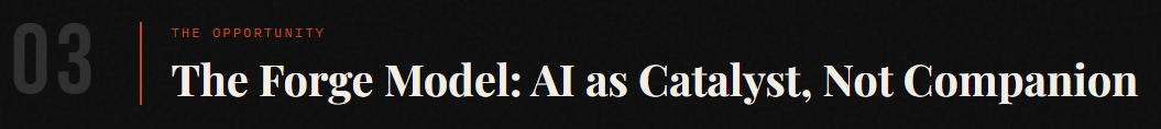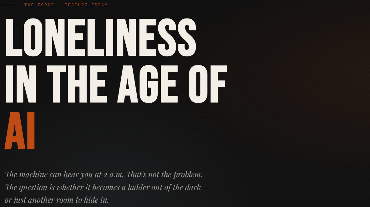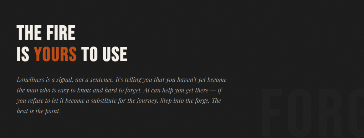A forge doesn't care about you. It just applies heat. What matters is what you put into it and what you do with what comes out. The men who will use AI well in the coming decade are not the ones who use it to feel less alone tonight — they're the ones who use it to become the kind of man other men want to be around.