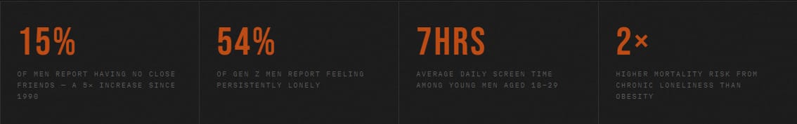 The surgeon general of the United States declared loneliness a public health epidemic. Study after study points to the same pattern: male friendships have collapsed over the past three decades. The average man has fewer close friends than at any recorded point in history. Many have zero — no one they'd call in a crisis, no one who truly knows them.