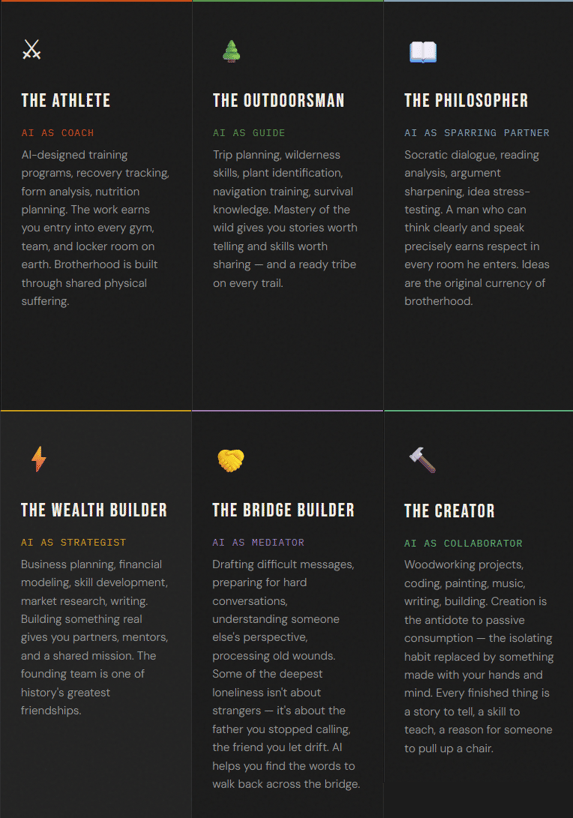 This is where the Forge archetypes become essential. Each one is a domain of mastery that doesn't just build skill — it builds belonging. The athlete earns brotherhood through shared suffering while pushing their physical limits. The outdoorsman finds his tribe on the trail. The philosopher earns respect in discourse. The wealth builder removes the financial constraints that foster anxiety and isolation. The bridge builder does the hardest work of all — walking back toward the people he's already lost. And the creator turns isolation itself into something worth gathering around. AI can accelerate entry into every one of these worlds. And those are just six of our fourteen archetypes.